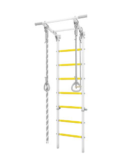 В детский спортивный комплекс входит навесное оборудование — трапеция, канат, гимнастические кольца треугольной формы, которые не проворачиваются во время занятий.